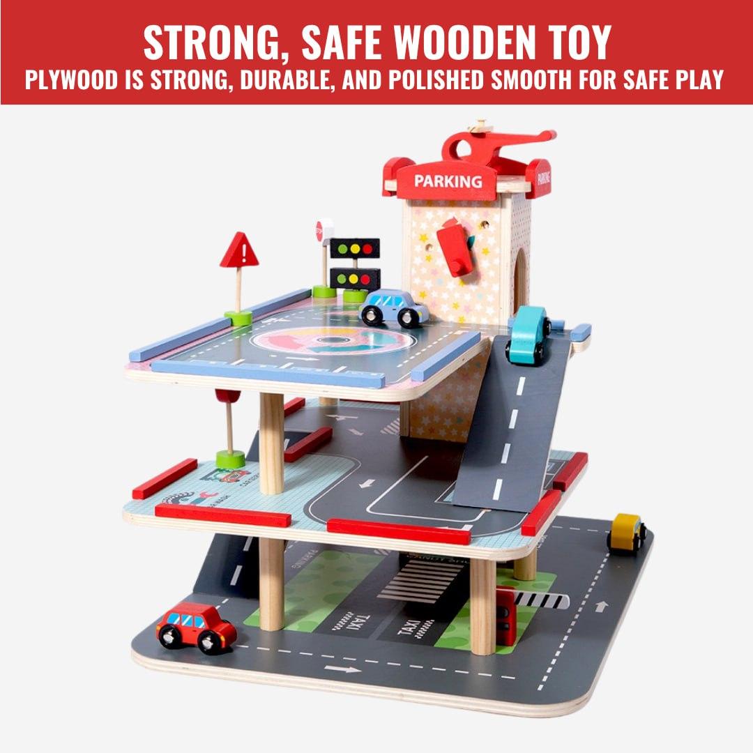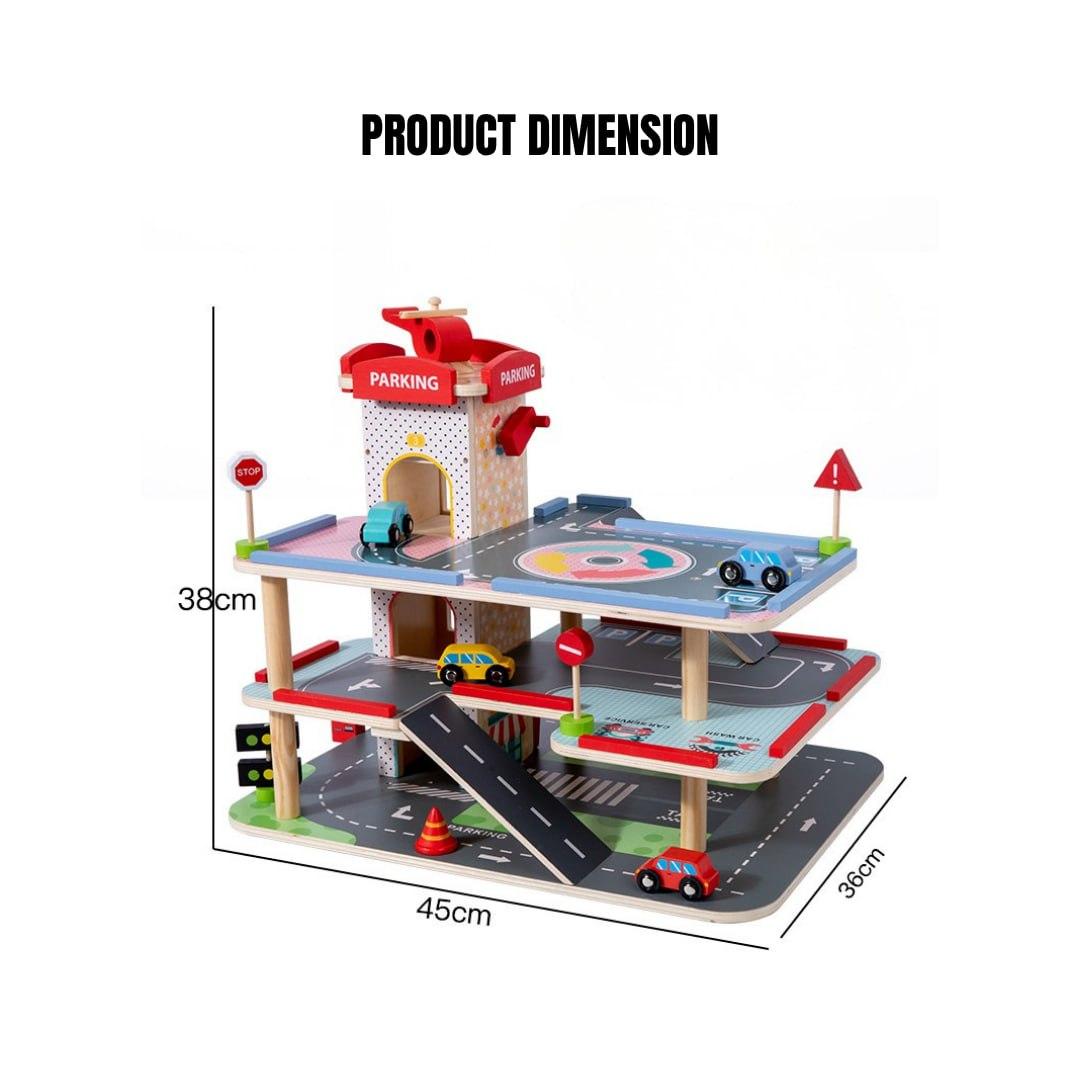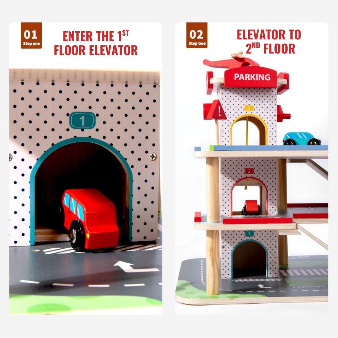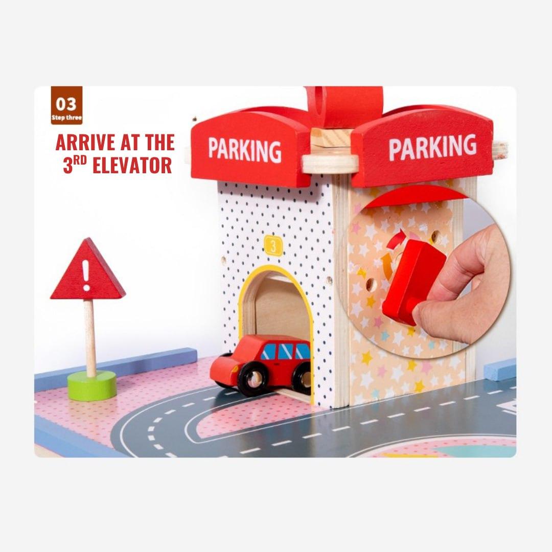 • 3-level wooden parking tower with ramps, elevator, and detailed road design for realistic play.