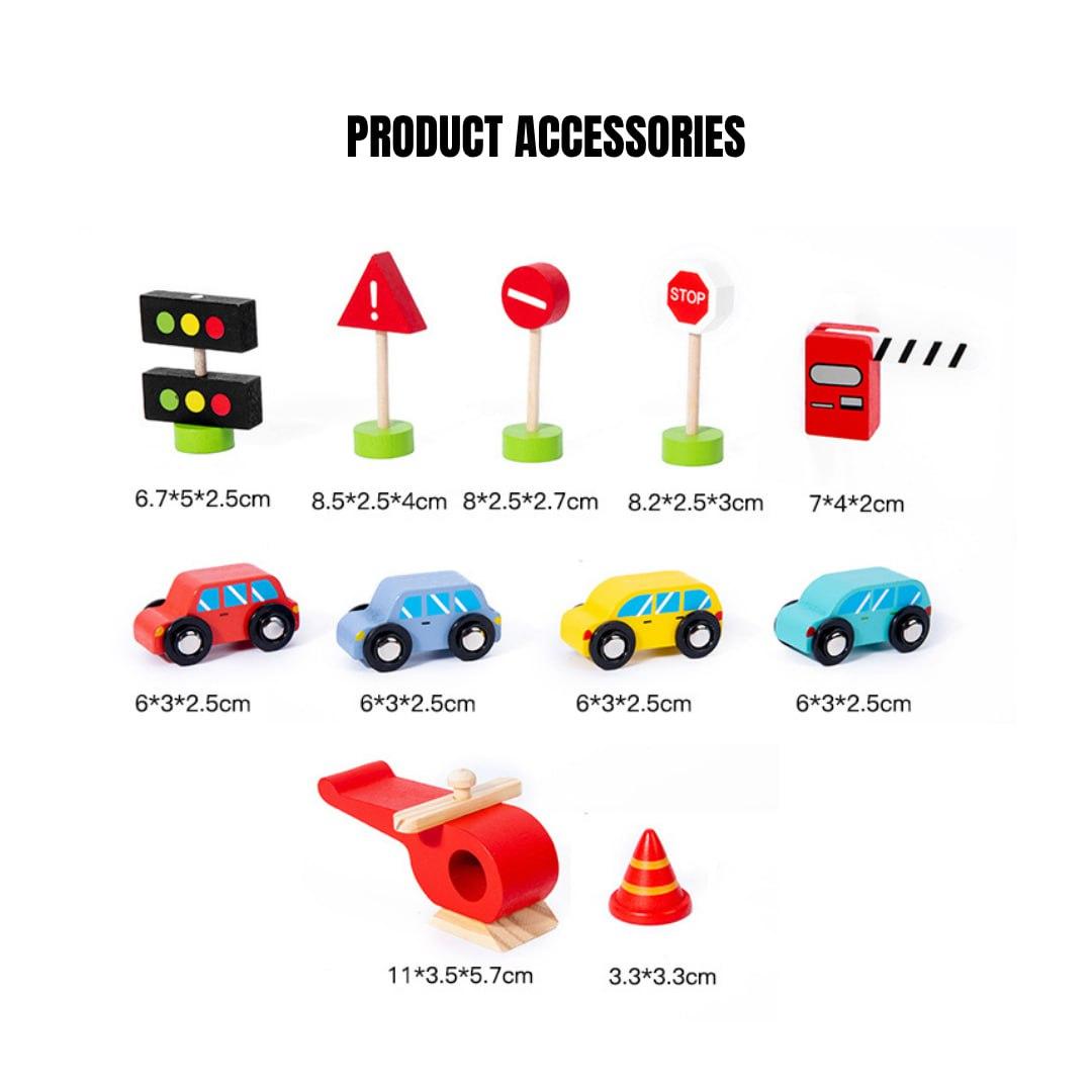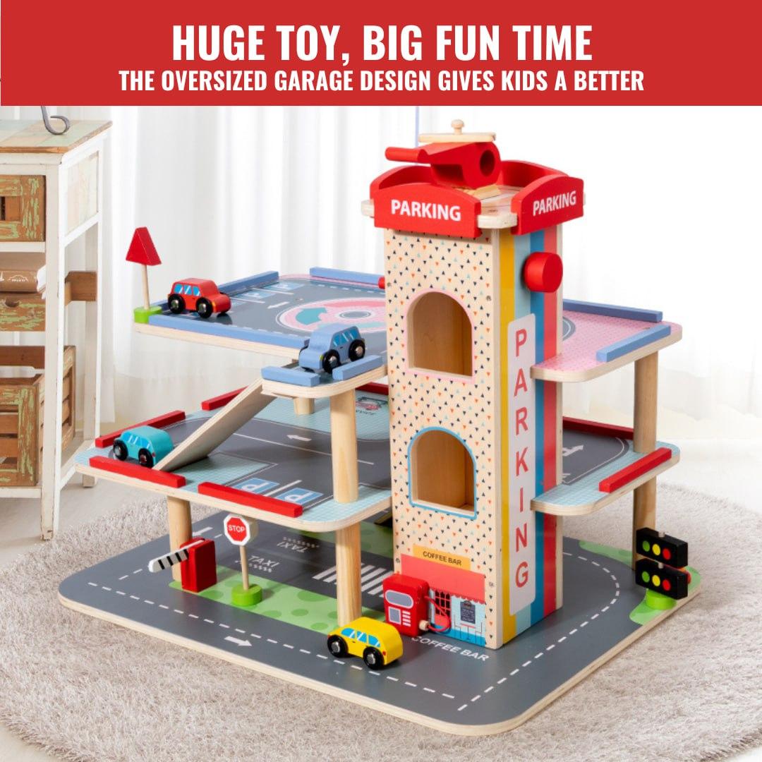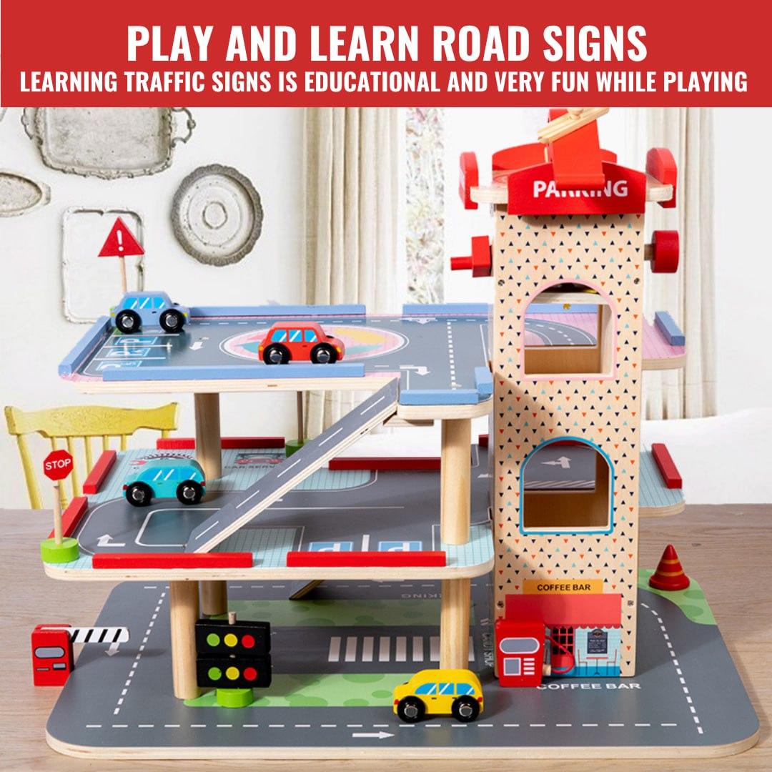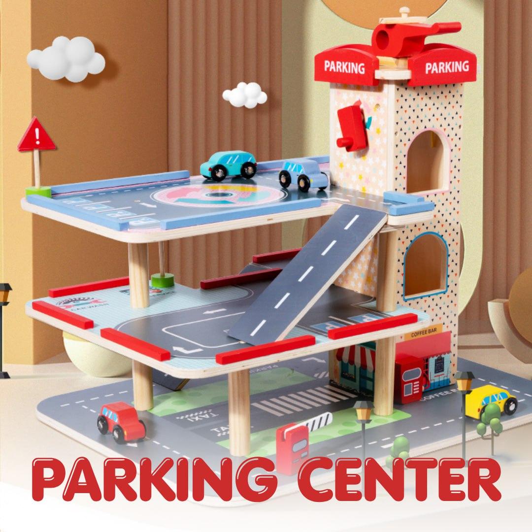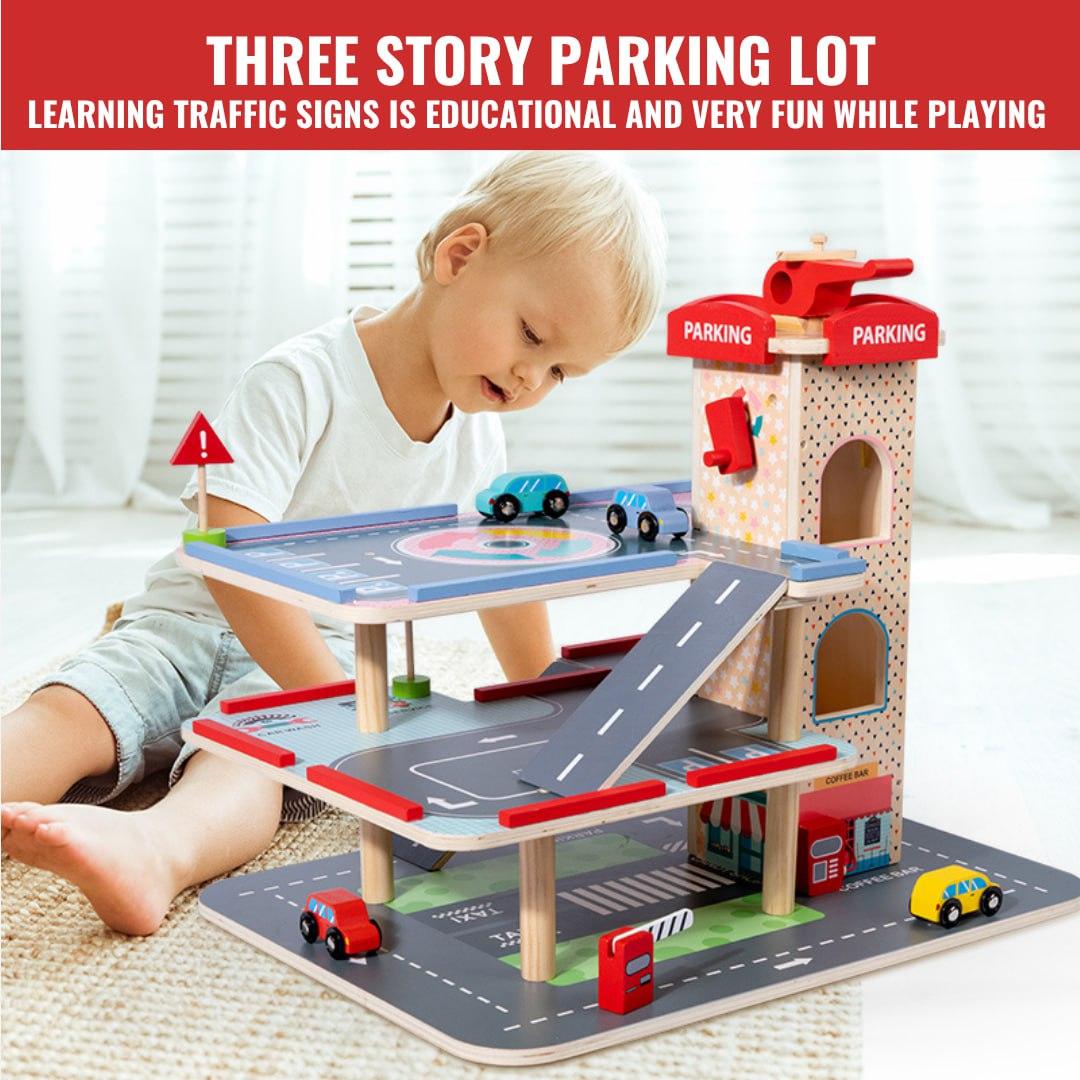 • 3-level wooden parking tower with ramps, elevator, and detailed road design for realistic play.