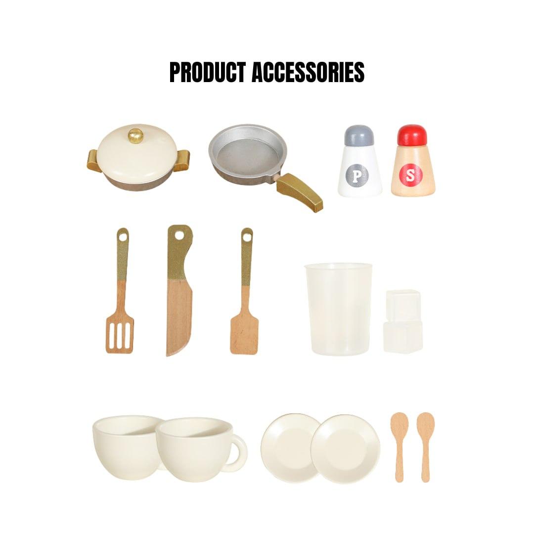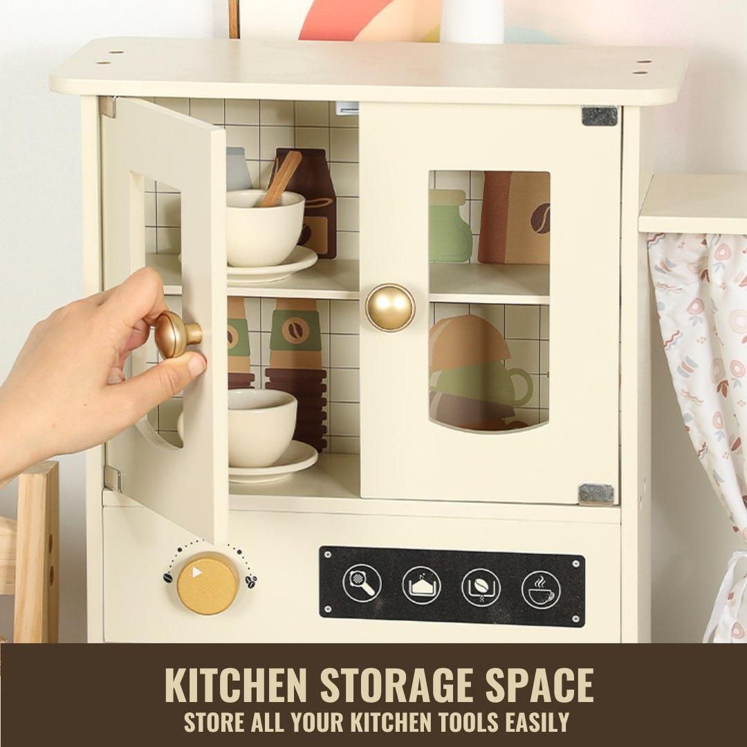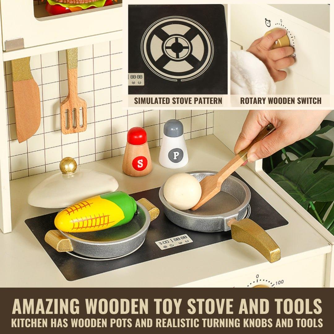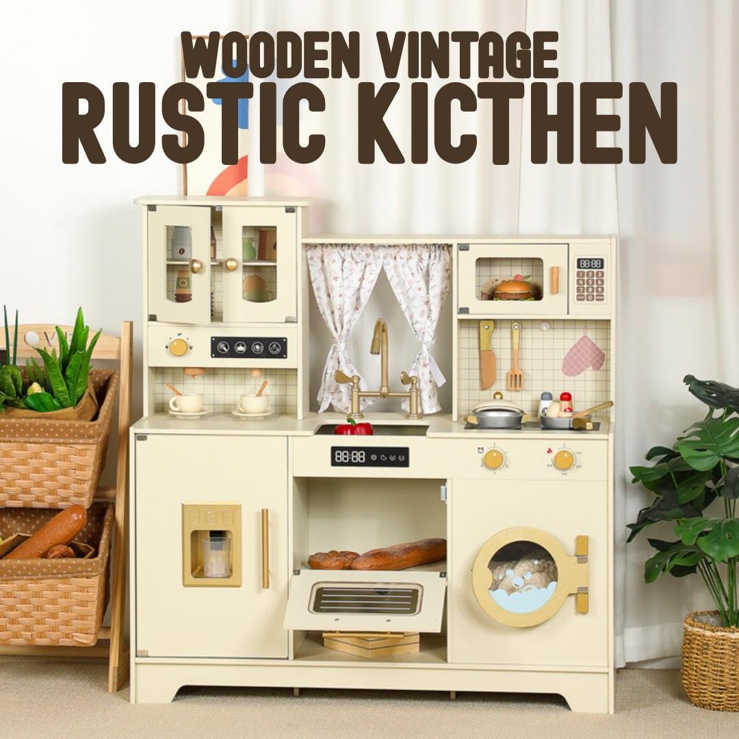 • A charming vintage-style wooden kitchen play set with a cozy rustic design, complete with stove, oven, sink, and mini appliances for creative play.