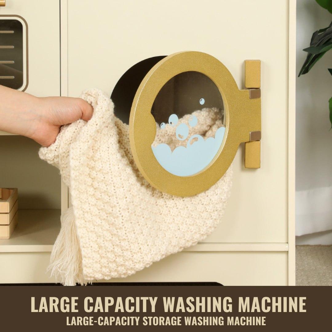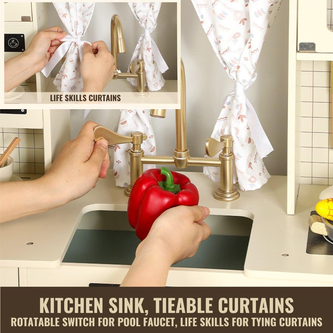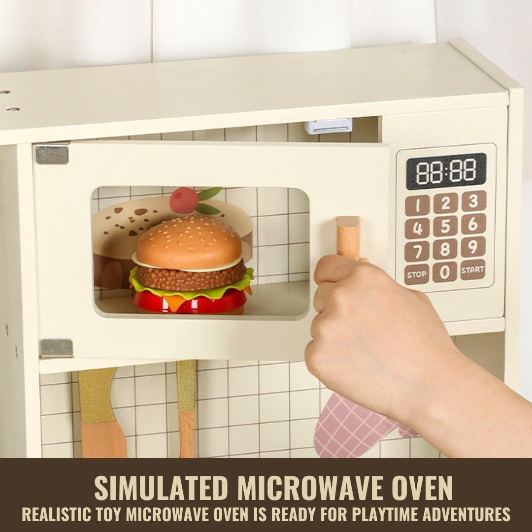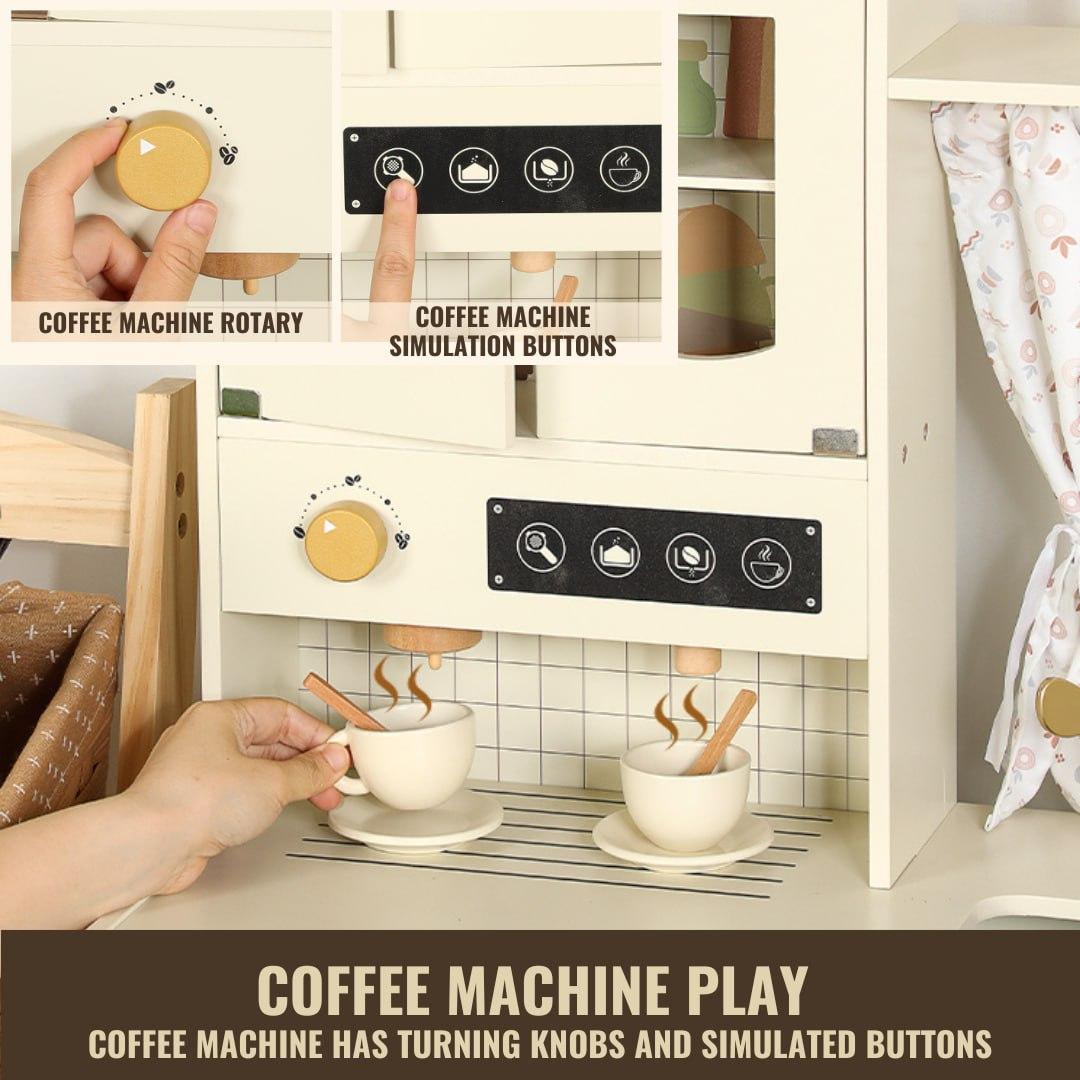 • A charming vintage-style wooden kitchen play set with a cozy rustic design, complete with stove, oven, sink, and mini appliances for creative play.